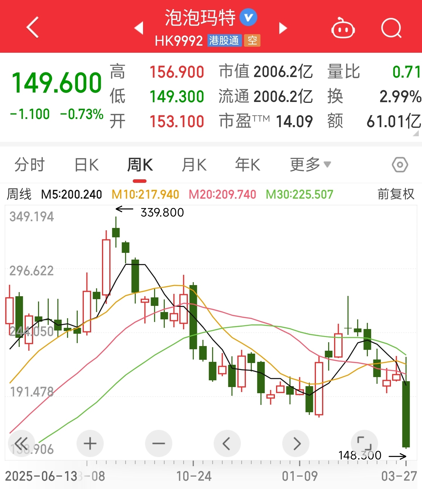 我是一直配有一定仓位给港股的,也有关注不少港股。其实我买阿里的钱,本来是想买泡泡玛特的,但我觉得潮玩IP的持续性还有待进一步观察,所以就没买。当时泡泡的价格在200-230之间,结果前几天出了财报后,两天就跌到150了,同期跌幅比我的阿里浮亏还大。