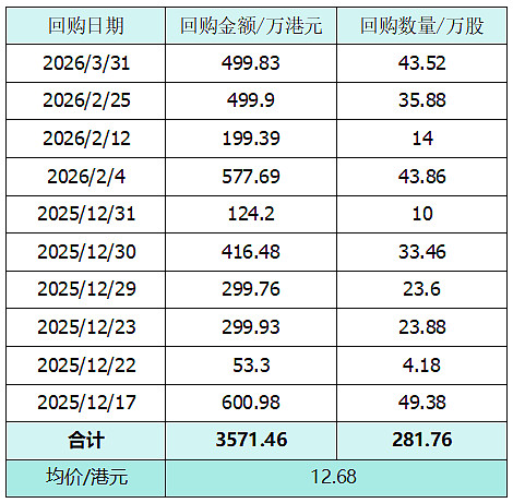 从2025-12-17至2026-3-31,海吉亚医疗一共回购3571万港元(见下图),按3亿的回购计划算,还剩约2.64亿回购额度。