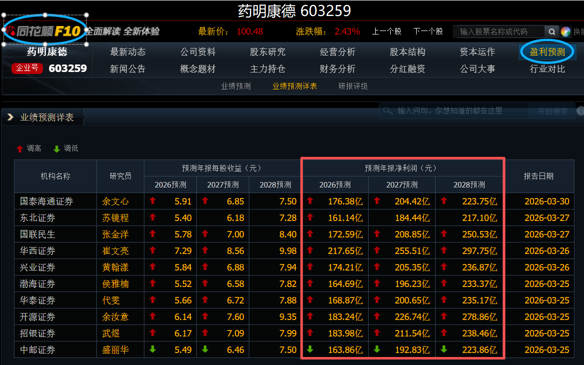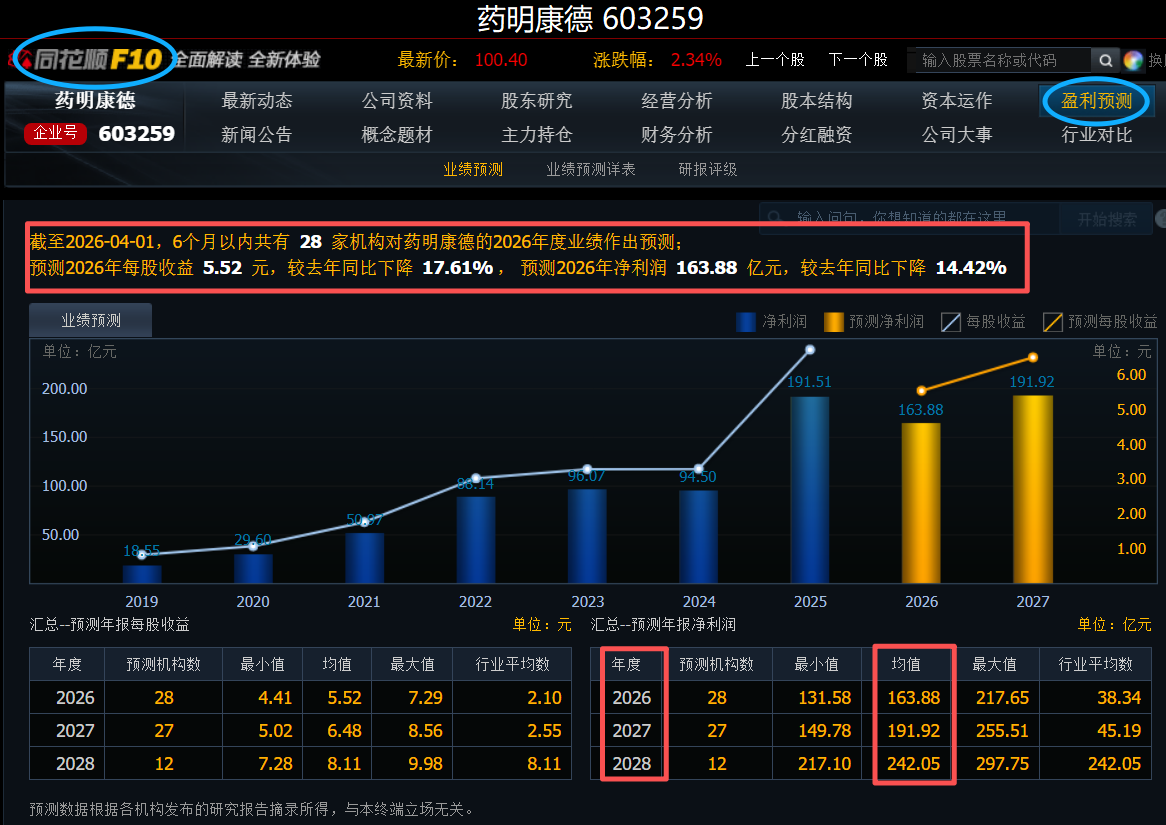 本文发一下同花顺软件汇总的各机构对药明康德的净利润预测。点开同花顺电脑版,再点击“个股页面→F10→盈利预测”就可以看到。这个以前只有25-27年的预测,现在更新为26-28年的了。