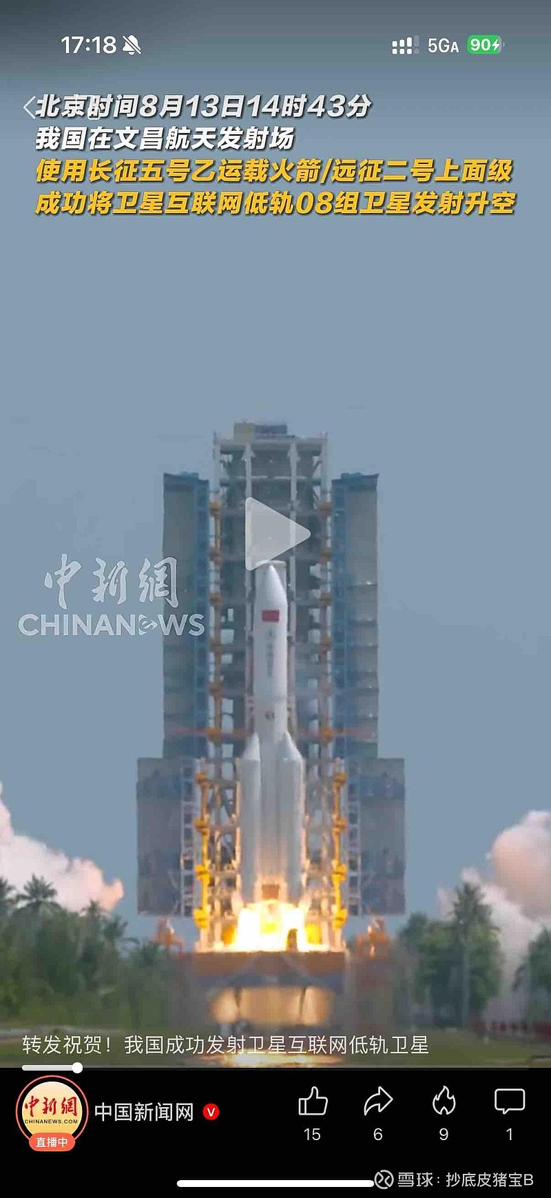 #商业航天# #中国星网# 2025年8月13日14时43分,我国在文昌航天发射场使用长征五号乙运载火箭(CZ-5B)/远征二号上面级成功将卫星互联网低轨08组卫星发射升空。
