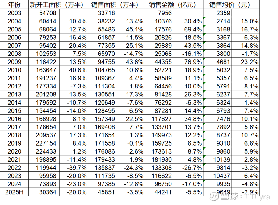 这是国家统计局公布的,2005年到2025年上半年的房地产数据,核心数据是新开工面积,销售面积,销售金额。