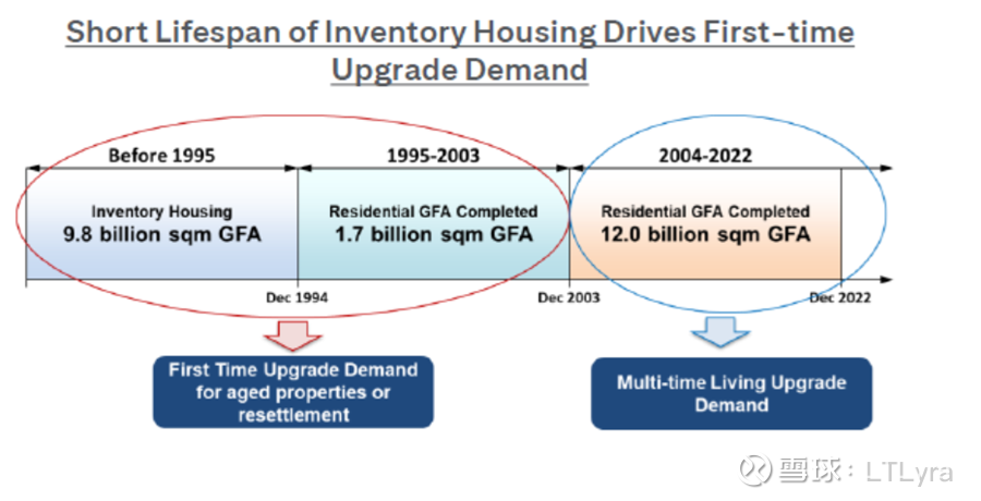 根据花旗的研报。我们现有住房结构是这样的,1995年之前建成的,大概98亿平;1995 ~2003年建成的,大概17亿平;2004 ~ 2022年建成的,大概120亿平。