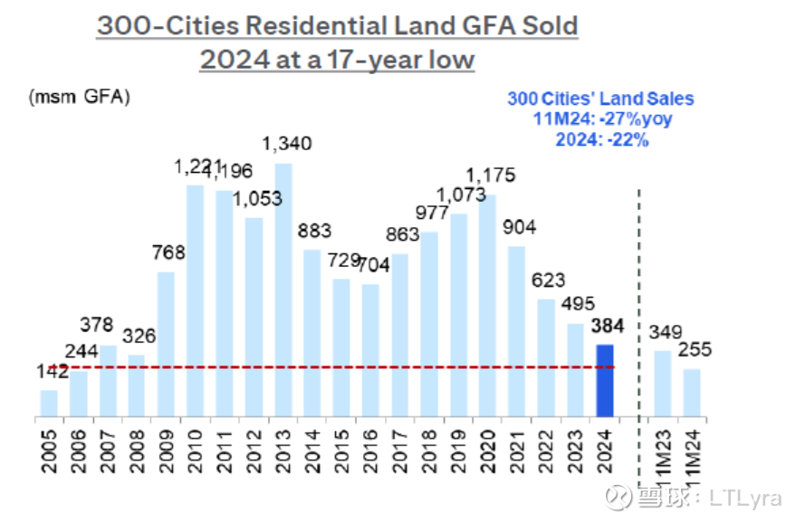 供应端,每年新开工面积,5年锐减73%,从22亿平到6亿平。并且,这些年每年的土地新出让面积,一样断崖式下滑,以至于从2023年开始,国家统计局不公布新出让土地面积和金额了。我引用一个花旗研报的数据,2005年开始的300城住宅用地出让面积,2024年是2020年的32%。