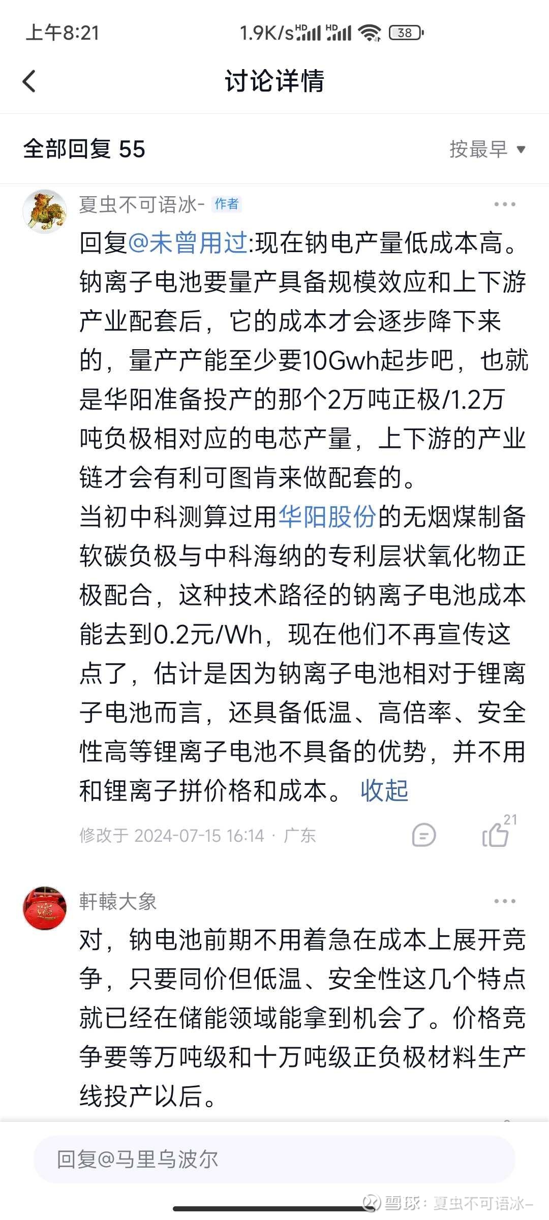 回复@推磨的小鱼: 这个万吨级正负极项目投产的意义,我之前就说过并不在于这些正负极材料现在能赚多少钱,意义在于这条技术路径彻底走通了,相关上下游厂家会积极进行配套,中科海纳这条技术路径的钠离子电池的成本因此将会大幅下降,那就全盘皆活了。。。