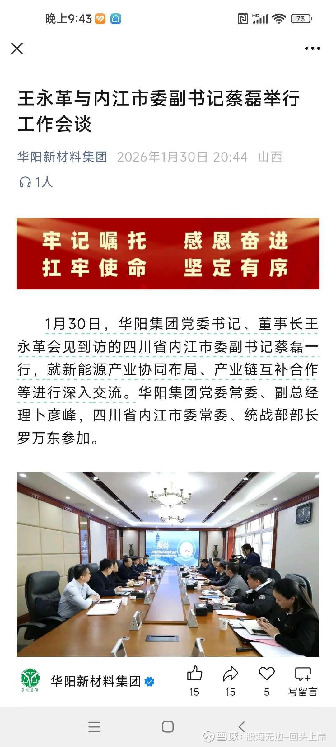 双方有很大的合作空间,华阳可以在内江设立钠离子电池电芯/Pack生产基地或万吨级材料项目的西南分基地,形式可以是材料基地+应用示范+资本合作的组合模式。查看图片//@股海无边-回头上岸:回复@夏虫不可语冰-:教授,内江市的副书记带队去华阳集团应该是招商了,推进钠离子电池产业落地,内江的电池产业链在西部地区都算非常完备的,宁德时代在内江就建设有厂。 查看图片