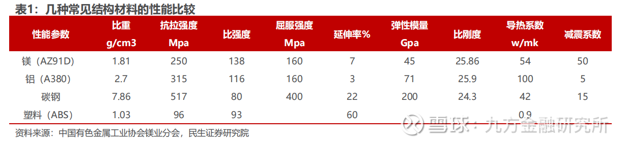 镁金属的密度小于钢铁和铝,仅为铝的2/3,因此对于相同体积的结构件来说,采用镁生产的部件重量比铝生产的部件要轻1/3,理论上可以支撑镁价/铝价=1.5。