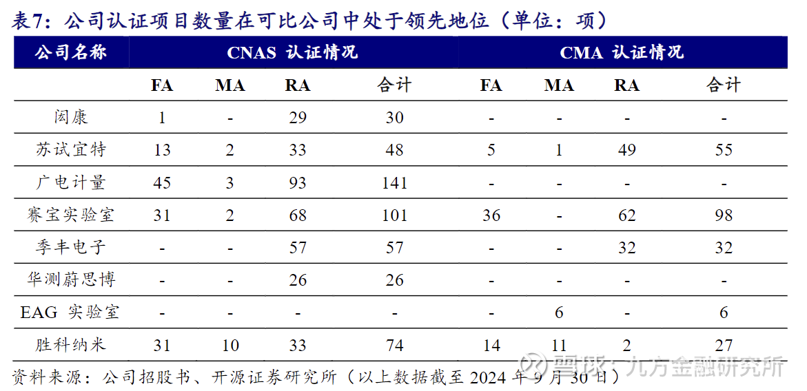 第二,公司具备强大的技术实力与know-how,资质认证数量领先。公司以技术驱动为核心竞争力,先进制程检测能力已覆盖至3nm,位居行业前列。2024年H1公司先进工艺(28nm以下)业务收入占比近八成。另外,公司CNAS、CMA资质认证数量在可比公司中处于领先地位,具备更强的检测项目的覆盖能力。