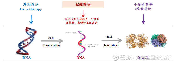 与传统的小分子药物和抗体药物相比,核酸药物能够在mRNA转录时进行干预,抑制疾病相关基因表达为病理性蛋白,或引入能够表达正常蛋白的基因弥补功能蛋白的不足,具有“治标治本”的特点。