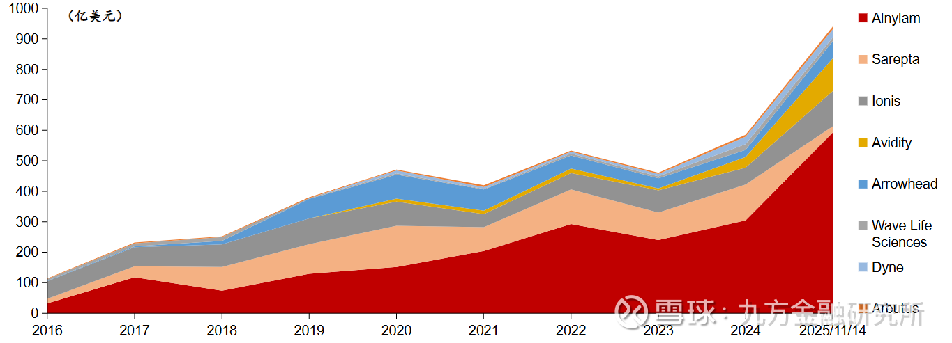 在小核酸药物技术持续进步的驱动下,Alnylam、Arrowhead、Ionis、Avidity等美股小核酸药物代表性公司总市值呈现出强劲的增长态势。2016年末,这8家公司合计市值约为114亿美元;截至2025年11月14日,总市值已攀升至941亿美元,充分彰显小核酸行业的成长潜力。