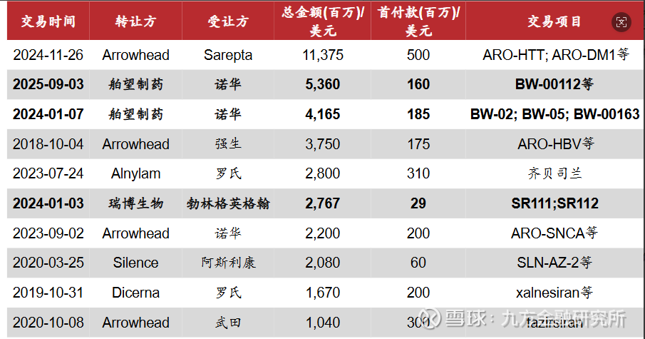 在siRNA领域Top10重磅交易中,单笔交易总金额最高(Arrowhead与Sarepta)达114亿美元,首付款达5亿美元;舶望制药先后于2024年1月及2025年9月与诺华达成重磅交易,两次合作交易总额合计超95亿美元,成为中国siRNA领域国际化合作的标杆案例;瑞博生物于2024年1月与BI达成合作共同开发MASH小核酸药物,总交易金额超过20亿美元。