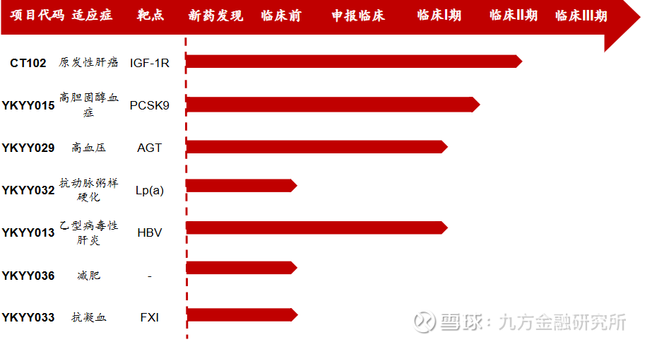 3)YKYY013(HBV siRNA,乙肝功能性治愈)国内I期已启动,YKYY032(Lp(a) siRNA,抗动脉硬化风险)、YKYY033(FXI siRNA,抗凝血)、YKYY036(减肥)等药物预计后续将陆续申报临床。
