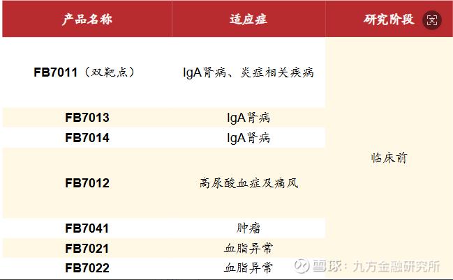1)针对IgA肾病,公司布局了三款靶向补体机制的小核酸药物,其中,FB7013是单靶点siRNA药物,临床前研究表明在健康猴上单次皮下给药,目标蛋白表达在16周内持续降低,最大降幅达到98%,预计FB7013在临床上可实现每6个月给药一针,该药预计2025年底递交IND;FB7011是双靶点siRNA药物,目前处于临床前,显示出具有更高疗效、更好安全性的潜在优势;