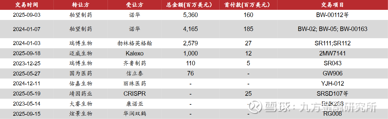 头部Biotech崛起:2024年1月,瑞博生物与勃林格殷格翰就MASH药物达成超20亿美元合作;舶望制药先后于2024年1月及2025年9月与诺华达成重磅交易,两次合作交易总额合计超95亿美元,成为中国siRNA领域国际化合作的标杆案例;2025年5月,靖因药业与CRISPR合作开发血栓治疗siRNA药物SRSD107,9500万美元首付款及超8亿美元里程碑付款。