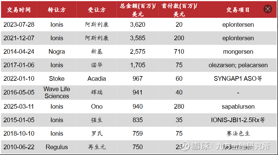 在ASO领域Top10重磅交易中,Ionis作为转让方参与了6笔交易,其中单笔交易总金额最高达36亿美元,系Ionis与阿斯利康就eplontersen的共同开发与商业化达成战略合作协议,凸显其在ASO领域的领先地位。