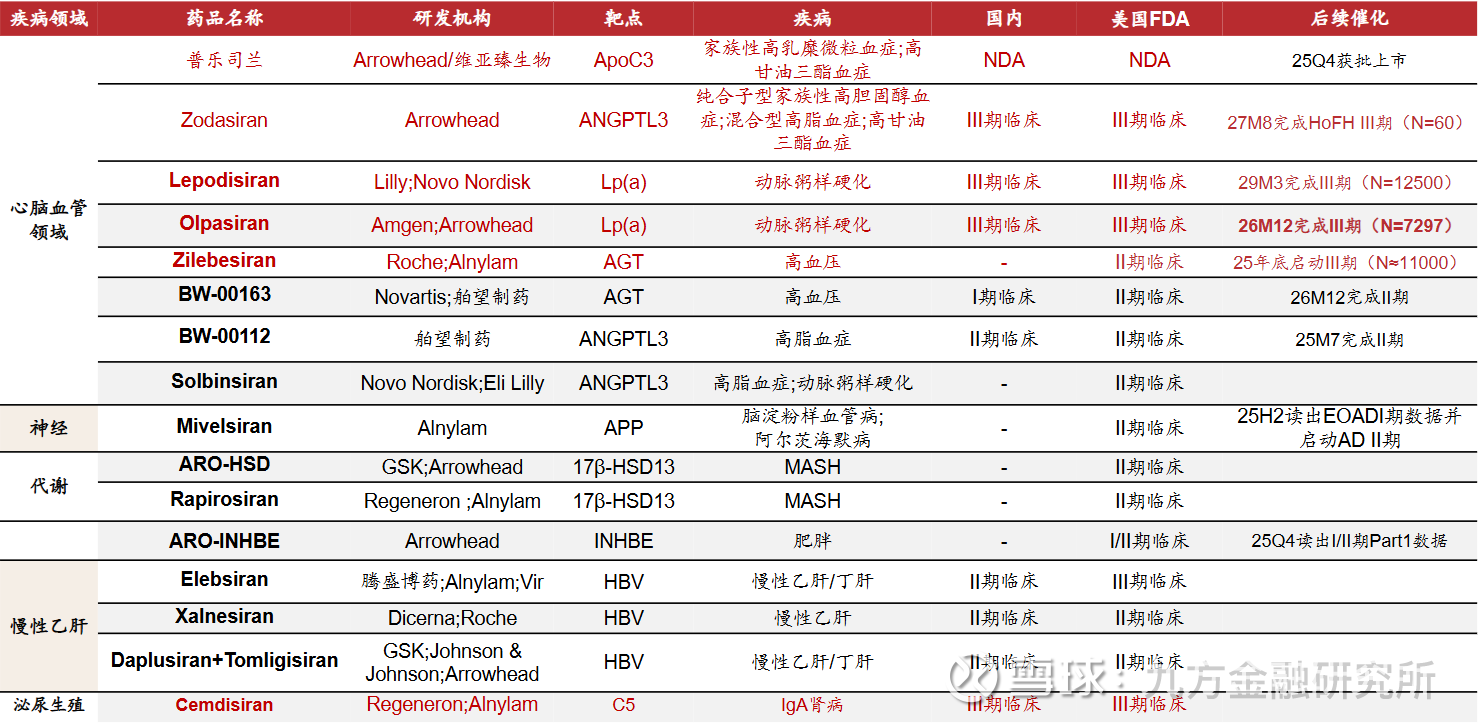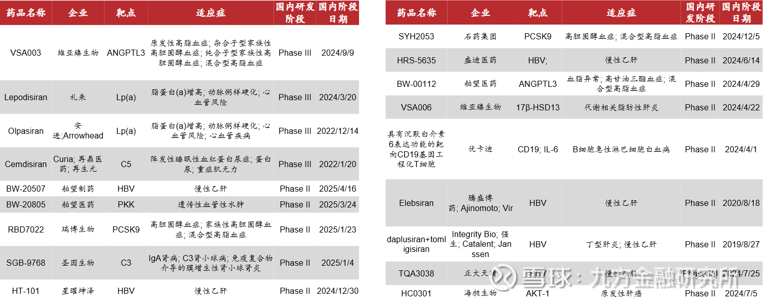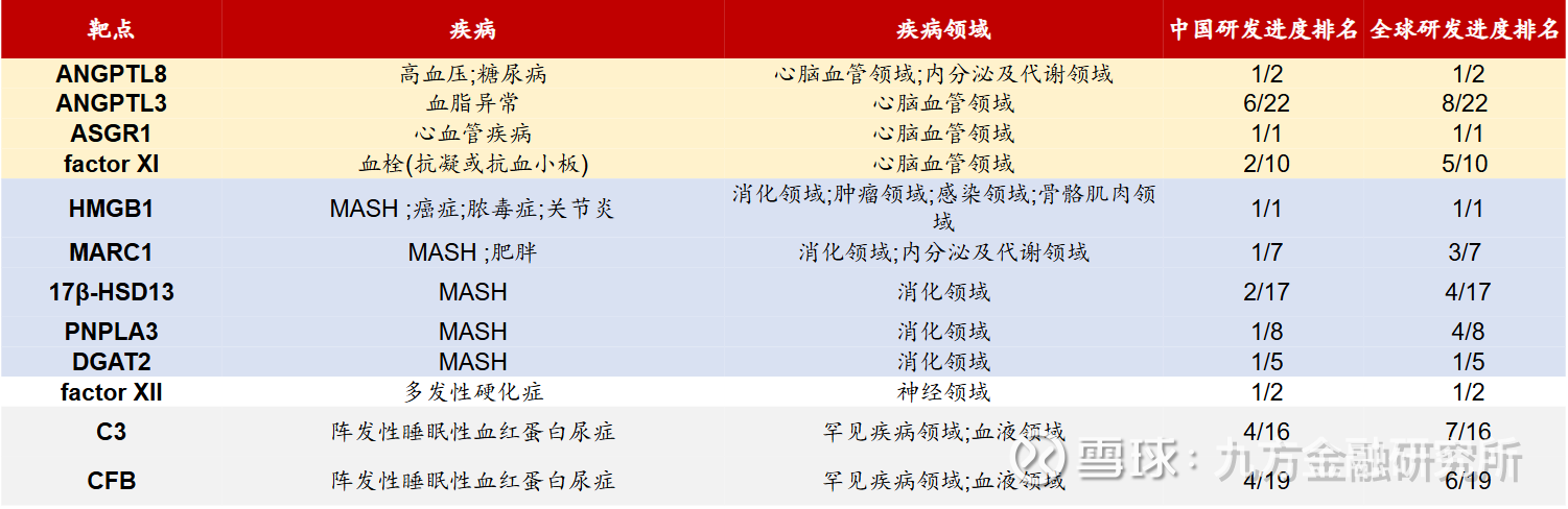 表:全球临床进展靠前的siRNA重点品种