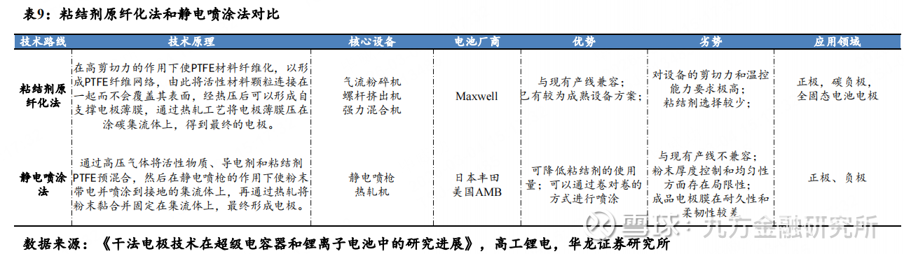 当前干法工艺主要围绕两条技术路线,即以特斯拉所收购Maxwell为代表的粘结剂原纤化法和以日本丰田、美国AMB为代表的静电喷涂法,粘结剂原纤化法可与现有产线兼容,在性能稳定性和可加工性上表现更优,目前设备端已有较为成熟的量产方案推出,已基本走通大规模生产路径。相较于仍处于实验阶段的静电喷涂法,粘结剂原纤化法有望逐渐成为主流路线。