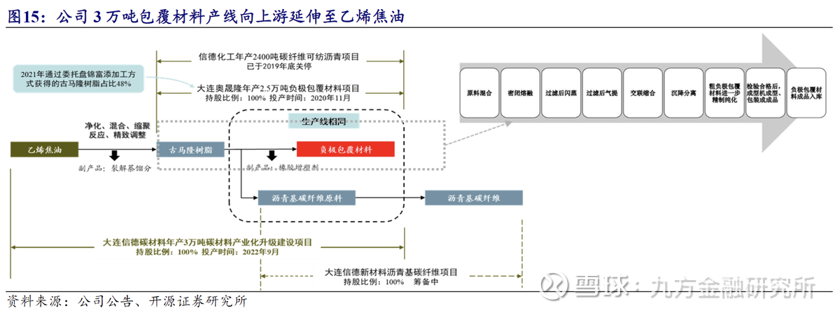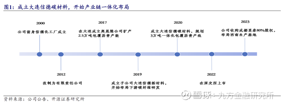 公司为行业领先碳基新型材料供应商,产业链一体化布局逐步形成。公司前身为辽宁信德化工厂,成立于 2000 年,2012 年由股份制公司改制为有限责任公司,并于 2020 年再次整体变更为股份有限公司。公司深耕沥青相关产品,是行业领先的碳基新型材料供应商。2017 年,公司抓住动力电池风口率先在大连规划 2.5 万吨包覆沥青产能,实现产销双旺成为国内负极包覆材料龙头。2019 年公司成立信德新材料开始布局下游碳纤维产品的研发,2020 年公司开始规划 3 万吨一体化包覆沥青新型产线,将使用的原材料从古马隆树脂向上延伸到乙烯焦油,产业链一体化布局逐步形成。