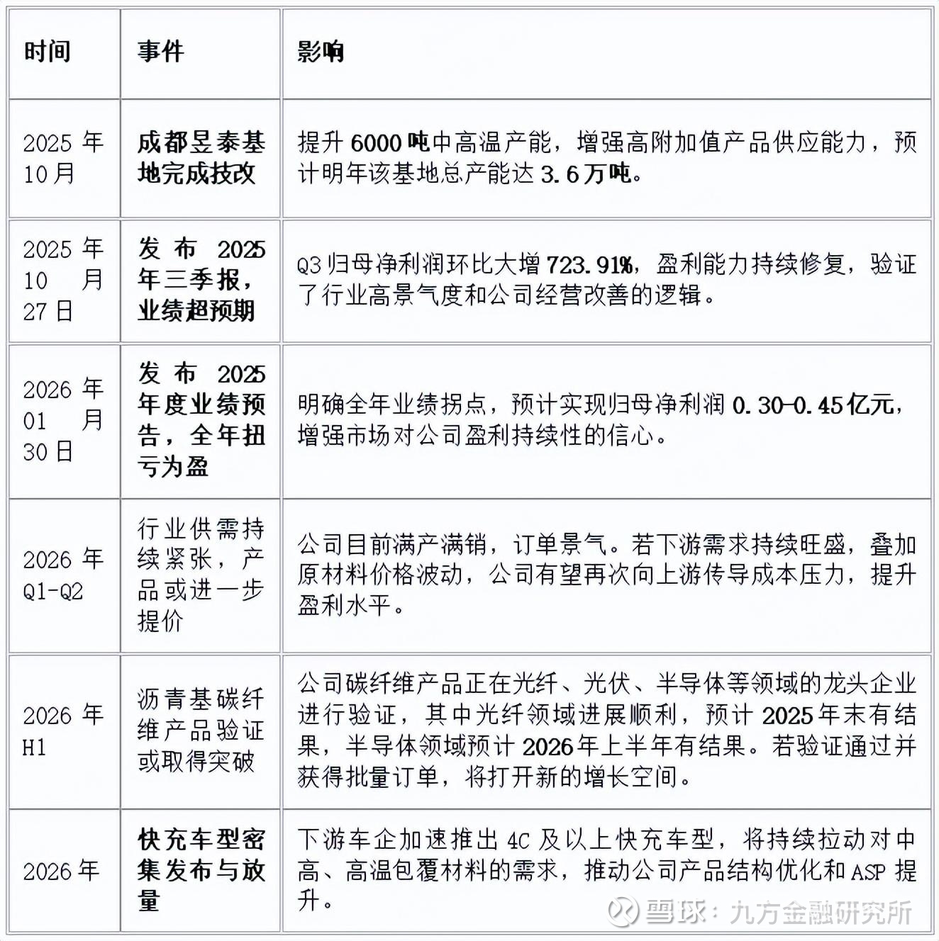公司目前产能利用率较高,2024Q4订单整体表现景气,2026年出货增长随产能释放有望进一步增长;盈利方面,大连基地中高温和昱泰基地成本优势增厚业绩;同时产业迭代趋势带动中高温占比提升,叠加副产品价格企稳回升,盈利有望进一步改善。此外,公司碳纤维业务布局持续推进,打开第二增长曲线,
