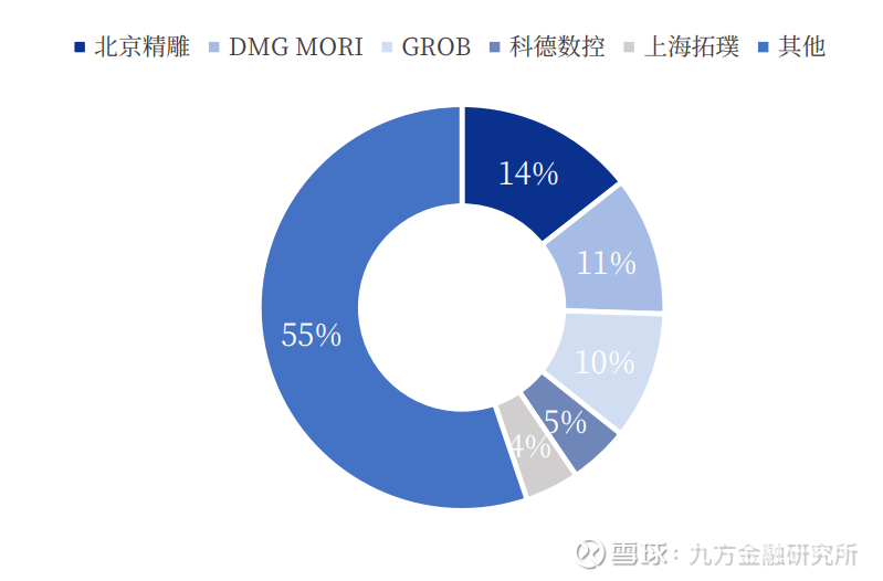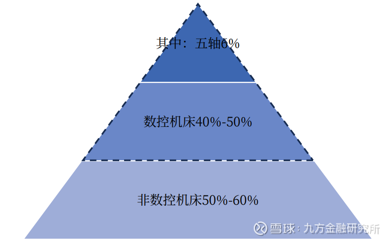 机床整体行业看,目前我国的机床消费市场按照档次分大致呈金字塔结构,底部是非数控的低档机床,占比50-60%,由国内厂商占领,主要通过打价格战来竞争,产能过剩;中高档的数控机床占比40-50%,其中中档机床是目前中外企业竞争的主要领域,高端五轴机床占比约6%,基本来源于进口,长期被欧日企业垄断。
