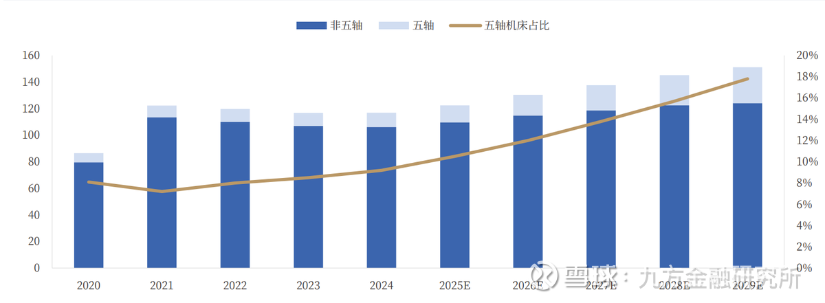 机床高端化势在必行,国产五轴机床有望崛起。从市场规模看,我国整体五轴联动数控机床市场规模持续扩张,2024年市场规模达到108亿元,预计到2029年将增长至270亿元,2024-2029年CAGR将达到20%。近年来一方面国产厂商技术能力持续提升,另一方面复杂多变的国际地缘政治局势下海外供应链存在不稳定因素,我国高端数控机床进口替代持续加速,内资厂商北京精雕、科德数控、上海拓璞等内资厂商市占率持续提升。
