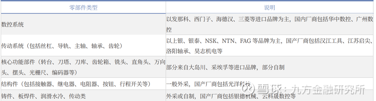 从机床零部件看,目前上游核心部件以进口日本、德国的公司为主,非核心部件正在逐步使用国产品牌。数控系统和传动系统以进口为主,公司集中在发那科、西门子等;核心功能部件如转台、刀库、刀塔等是部分进口,部分使用国产品牌,公司集中在台湾宝嘉成、旭阳、常州德速、北钜等。结构件和铸件、钣焊件以国产品牌为主,如光洋科技、云科晟数控等。