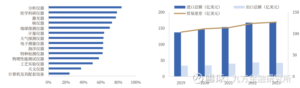 图:中国大型科研仪器进口率(左),中国科学仪器进出口贸易情况(右,贸易逆差为右轴)