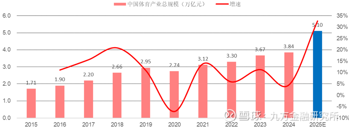 根据国家统计局和国家体育总局发布的数据,2024 年我国体育产业总规模已突破 3.8 万亿元,同比增长约 4.6%。从近年发展轨迹来看,中国体育产业呈现出稳健增长的态势:预计 2025 年突破 5 万亿元的目标,同比增速或超 30%。2025 年体育用品市场规模预计 2.49 万亿元,同比+8.7%。