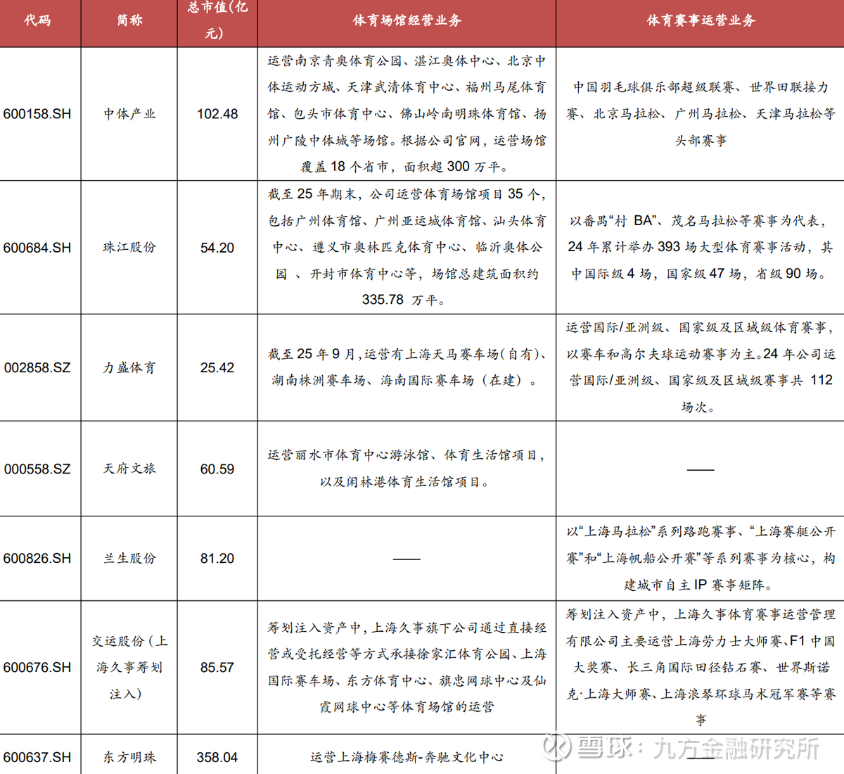 目前,A 股上市公司中,从事体育服务业务的核心公司主要包括:交运股份(资产待注入)、中体产业、珠江股份、力盛体育等。各公司主要体育赛事运营和体育场馆经营业务如下表所示: