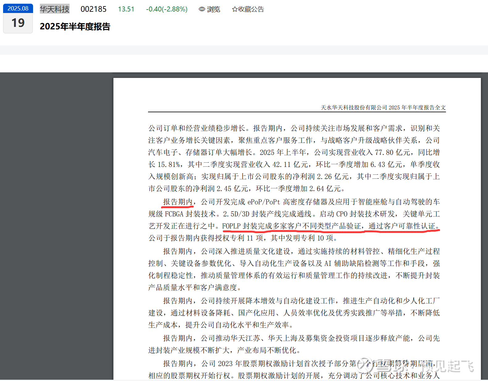 挖掘2025年半年报,涉及FOPLP(扇出型面板级封装)技术的企业有$华天科技(SZ002185)$ 、$莱宝高科(SZ002106)$