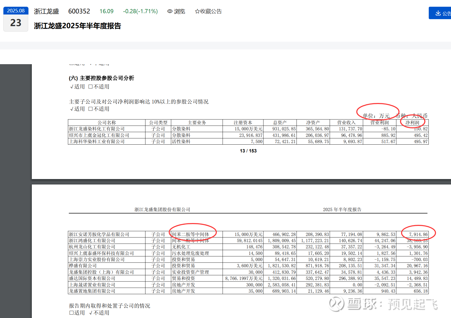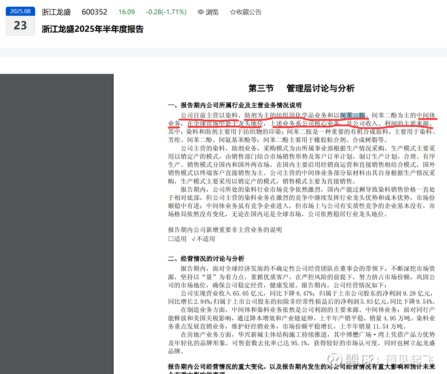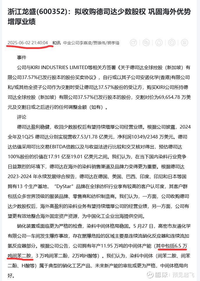 有依有据,我们挖掘2025年半年度报,发现涉及主营间苯二胺的企业有$浙江龙盛(SH600352)$ 和$华尔泰(SZ001217)$ 。