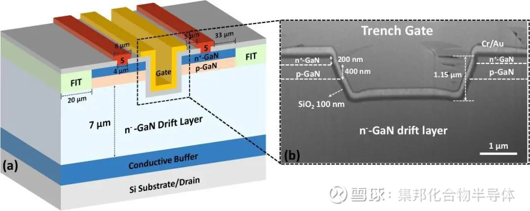 图为:(a)具有氟注入端终端(FIT-MOS)的全垂直硅基氮化镓沟槽 MOSFET 的结构示意图和(b)沟槽栅极区域截面扫描电子显微镜(SEM)图像