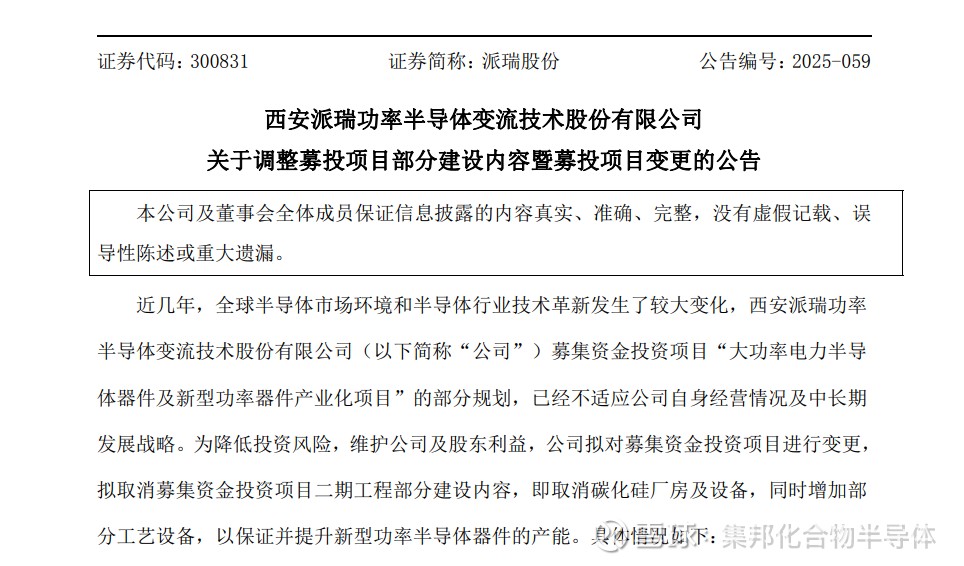 该公司表示,本次募集资金投资项目变更,仅取消碳化硅器件相关产线,减少年产碳化硅0.4万片的产能,不会对公司募投项目的产能及收益产生重大影响。后续公司将深耕现有优势业务,增加产品种类,扩大产能,并积极拓展新业务。