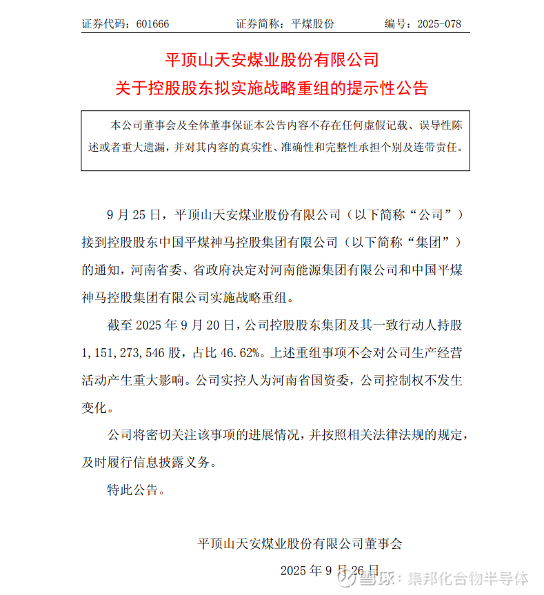 9月25日,河南省委、省政府正式批复,中国平煤神马控股集团有限公司(简称“平煤神马”)将与河南能源集团有限公司(简称“河南能源”)开展全方位战略重组。此次重组涉及多家上市公司,包括平煤股份、神马股份、易成新能、硅烷科技以及大有能源,均已发布相关公告。