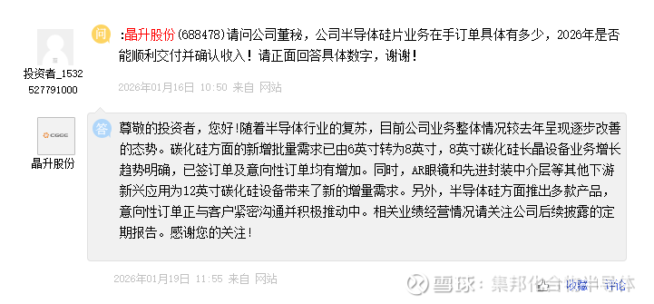 1月19日,晶升股份在回答投资者提问时表示,随着半导体行业的复苏,目前公司业务整体情况较去年呈现逐步改善的态势。碳化硅方面的新增批量需求已由6英寸转为8英寸,8英寸碳化硅长晶设备业务增长趋势明确,已签订单及意向性订单均有增加。