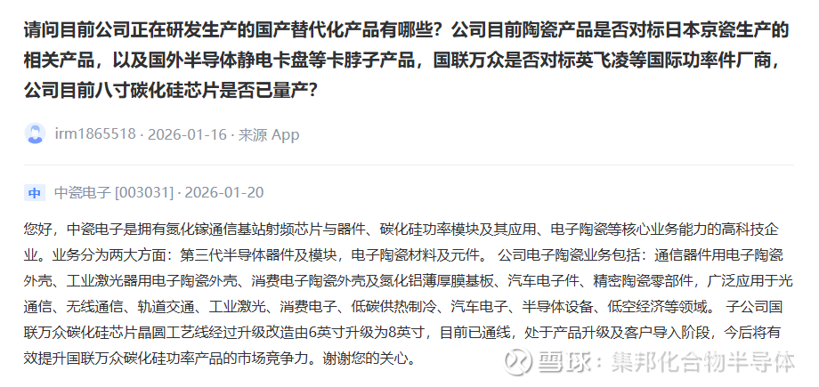 1月20日,中瓷电子在互动平台回答投资者提问时表示,子公司#国联万众 碳化硅芯片晶圆工艺线经过升级改造由6英寸升级为8英寸,目前已通线,处于产品升级及客户导入阶段,今后将有效提升国联万众碳化硅功率产品的市场竞争力。