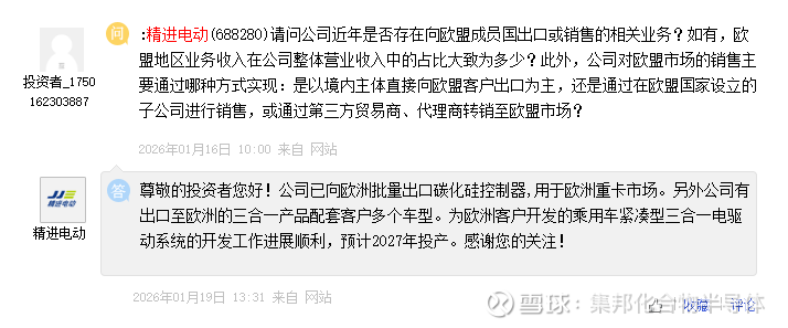 1月19日,精进电动在互动平台回答投资者提问时表示,公司已向欧洲批量出口碳化硅控制器,用于欧洲重卡市场。另外公司有出口至欧洲的三合一产品配套客户多个车型。为欧洲客户开发的乘用车紧凑型三合一电驱动系统的开发工作进展顺利,预计2027年投产。