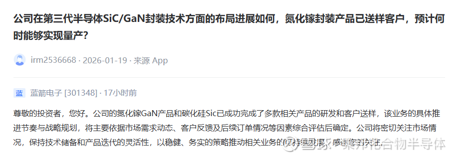 资料显示,蓝箭电子主要从事半导体封装测试业务,为半导体行业及下游领域提供分立器件和集成电路产品。在在碳化硅与氮化镓领域以封测为核心,同步推进 SiC/GaN 器件封测技术研发、产品送样与客户拓展。