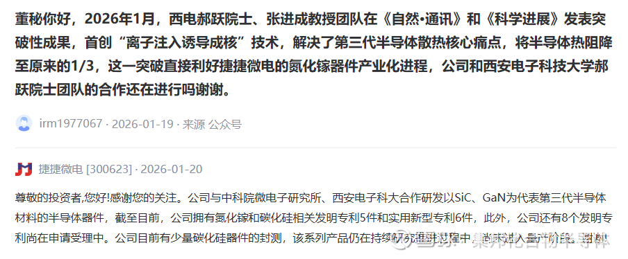 1月20日,捷捷微电在互动平台称,公司与中科院微电子研究所、西安电子科大合作研发以SiC、GaN为代表第三代半导体材料的半导体器件,截至目前,公司拥有氮化镓和碳化硅相关发明专利5件和实用新型专利6件,此外,公司还有8个发明专利尚在申请受理中。