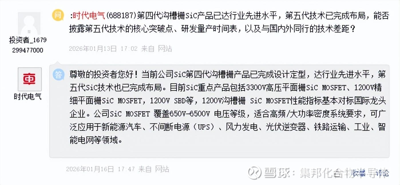 1月16日,时代电气在互动平台回答投资者提问时表示,当前公司SiC第四代沟槽栅产品已完成设计定型,达行业先进水平,第五代SiC技术也已完成布局。