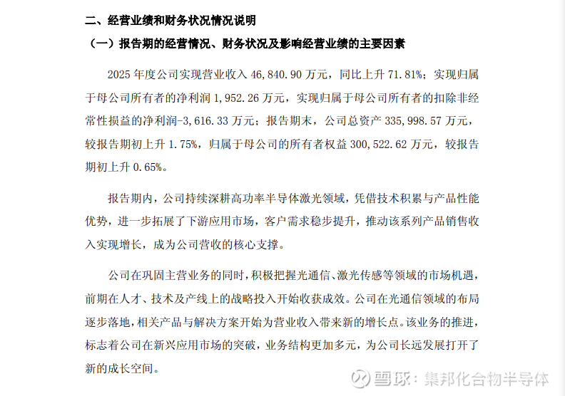 从财务数据分析,长光华芯的业绩反转主要得益于其在高功率半导体激光领域的持续深耕。作为工业激光器及光通信模块的核心元器件供应商,公司在2025年有效抓住了下游应用市场的复苏机遇。