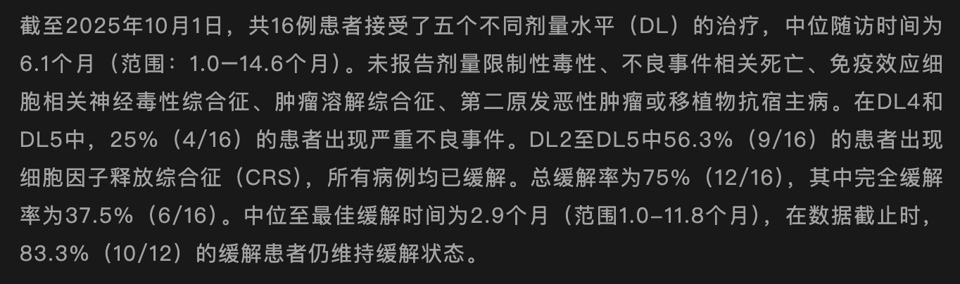 • 0 例 ICANS(未观察到神经毒性信号):在当前样本中未出现像手抖、失语、癫痫甚至脑水肿这样可怕的副作用。这意味