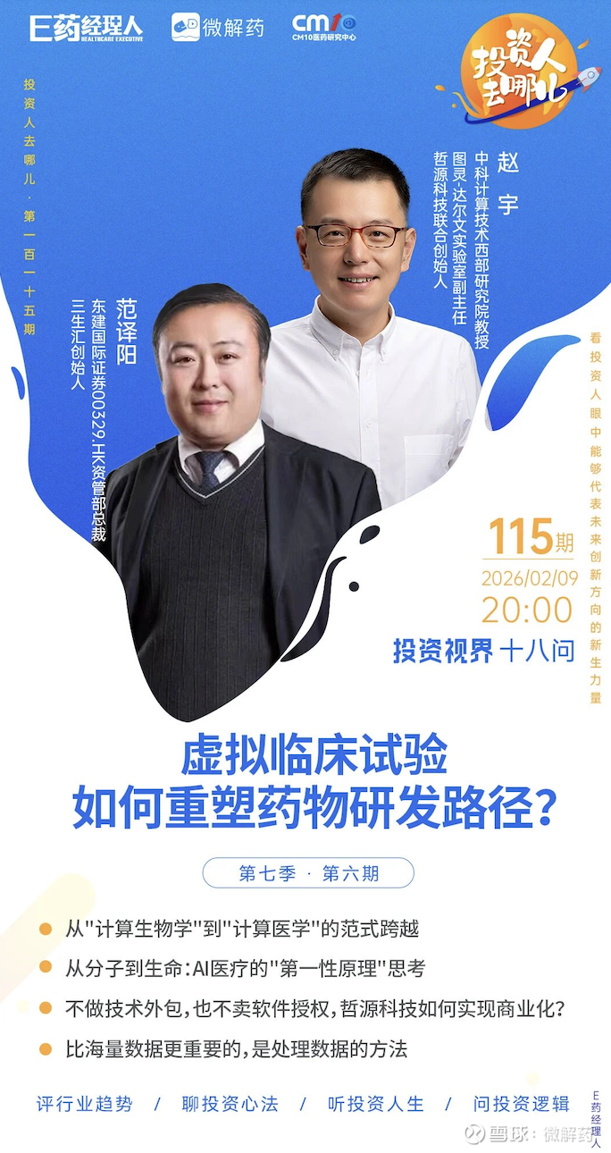 当全球药物研发深陷“反摩尔定律”——投入倍增、产出锐减的困境,一场由计算科学驱动的范式革命正在悄然发生。2026年2月9日20:00,E药经理人·微解药《投资视界十八问》第115期特邀中科计算技术西部研究院教授,图灵-达尔文实验室副主任,哲源科技联合创始人赵宇,与主持人范译阳深度探讨“虚拟临床试验如何重塑药物研发路径”。