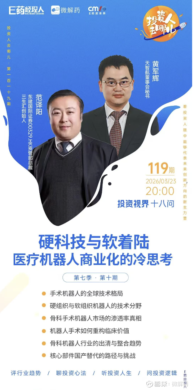 2026年3月23日20:00,E药经理人·微解药《投资视界十八问》(第119期)聚焦“硬科技与软着陆——医疗机器人商业化的冷思考”,特邀天智航董事会秘书黄军辉,与主持人东建国际证券00329.HK资管部总裁,三生汇创始人范译阳(主理人)展开深度对话,欢迎各位同仁预约观看。