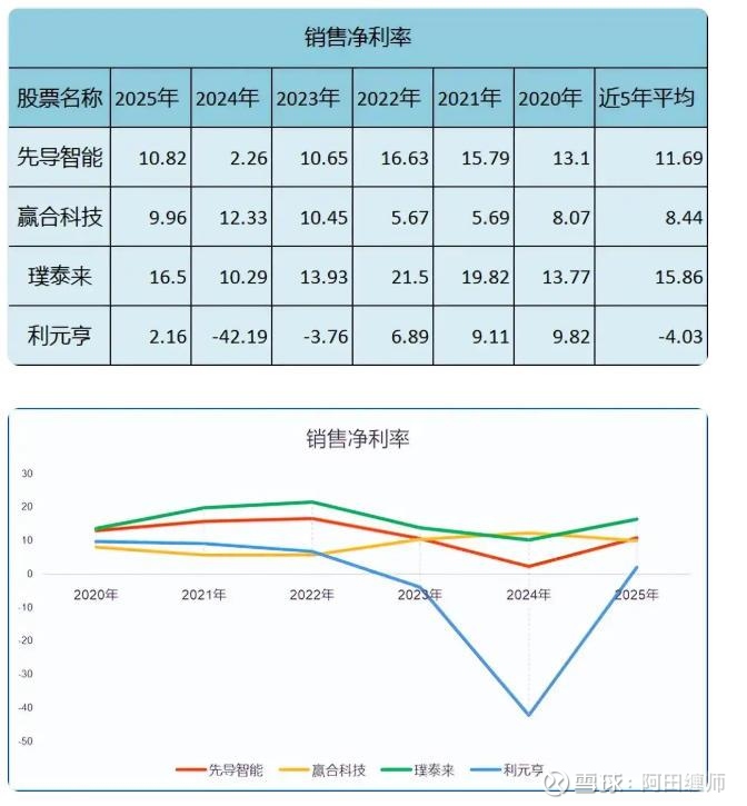 过去5年,除利元亨外,其它三家销售净利率均为正。利元亨2024年和2023年均为负,2024年亏损超10亿。