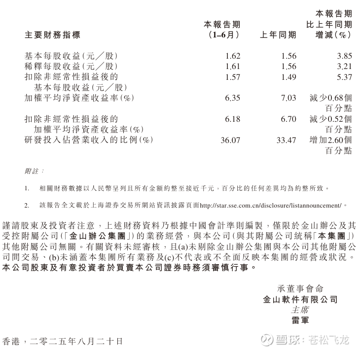 金山软件2025年上半年主要财务指标: