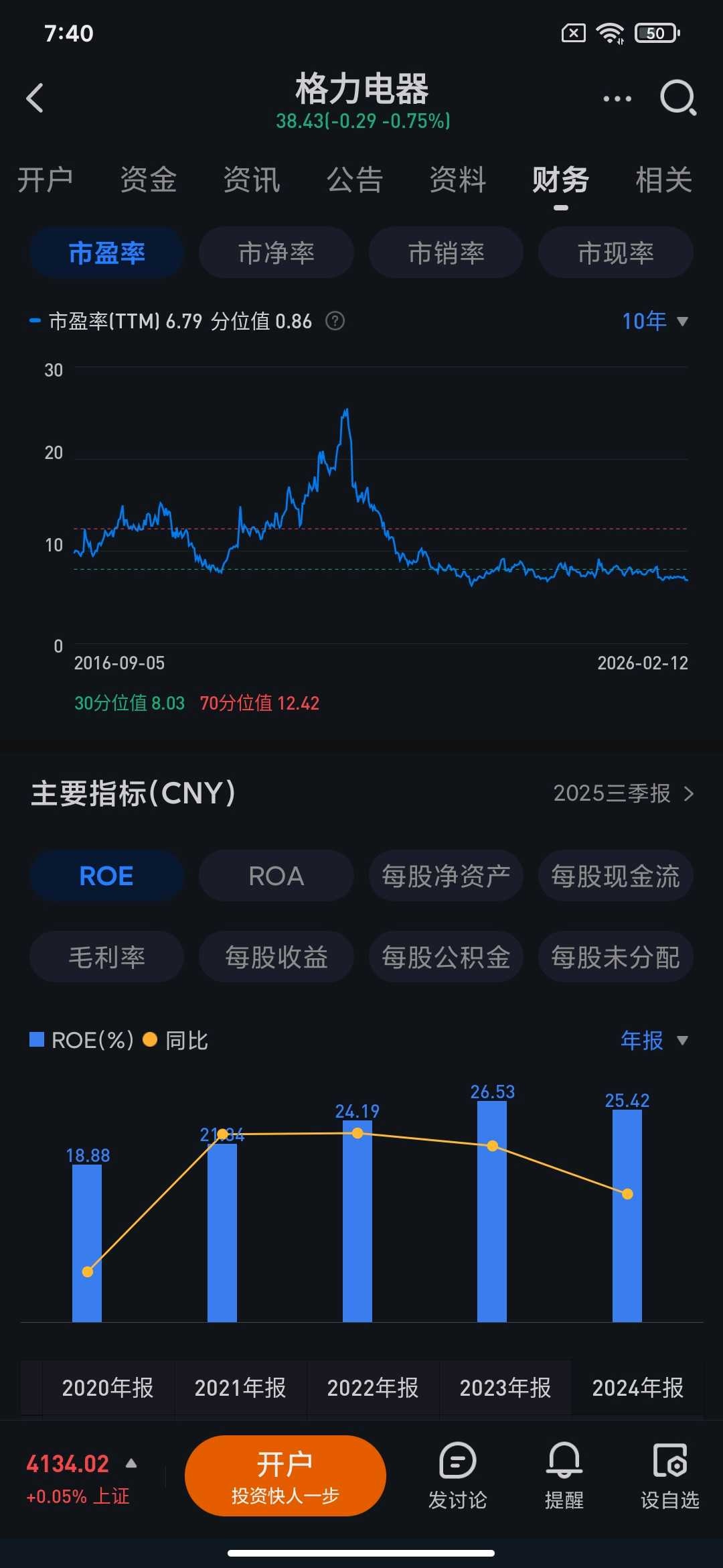 截至2026年2月12日, 格力电器(000651) 股价38.43元 市盈率 6.79倍(TTM) 市净率 1.49 股息率 7.81% 估值全市场最低,股息全场最高