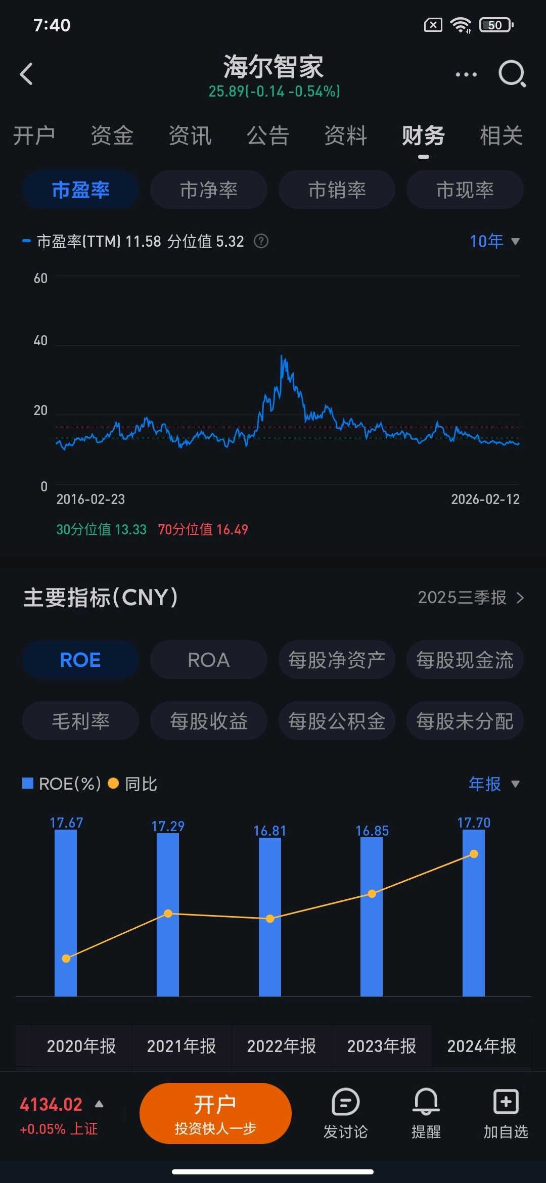海尔智家(600690) 股价25.89 市盈率11.58倍(TTM)市净率2.03 股息率 4.77%