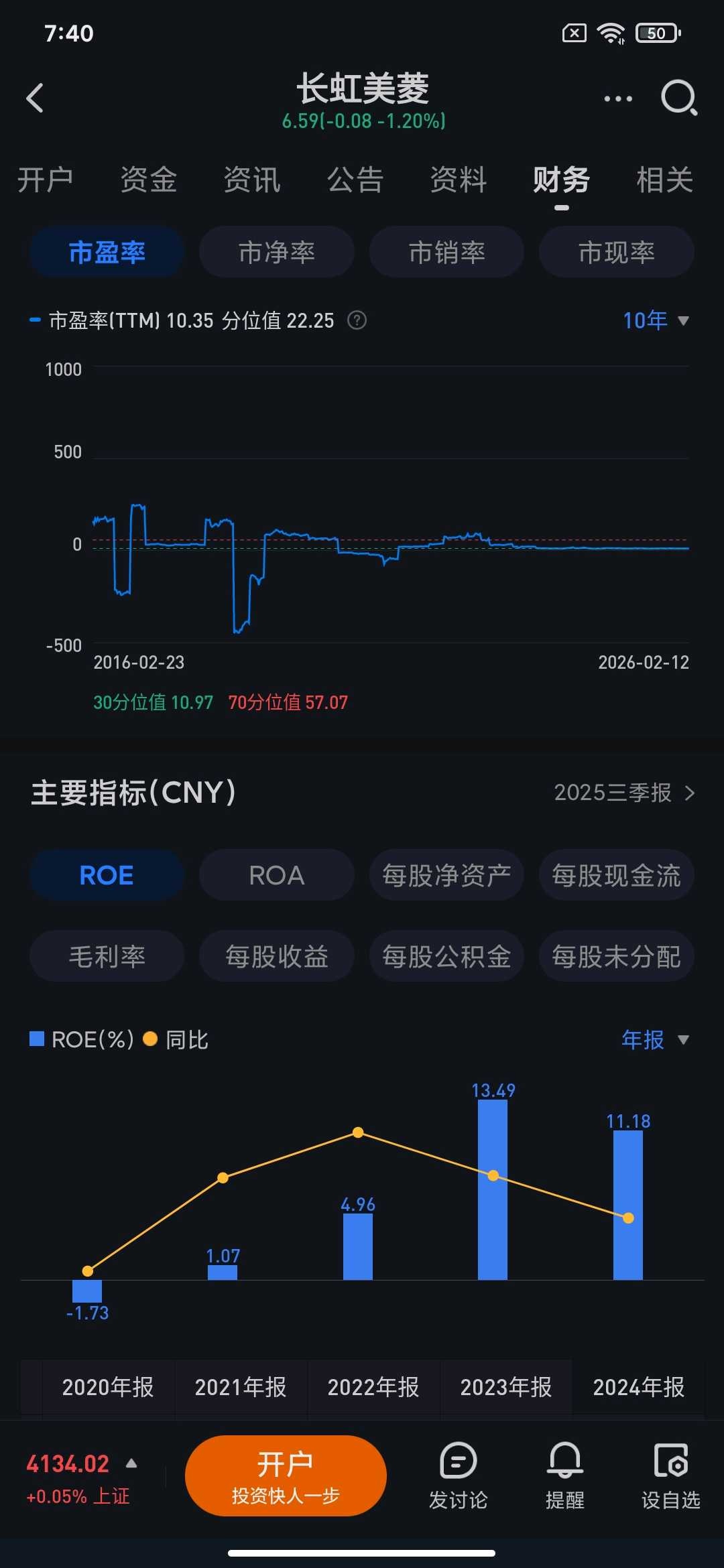 股价与市值:截至昨晚(2月12日)收盘,长虹美菱6.59元,滚动PE 10.35倍,总市值67.87亿。