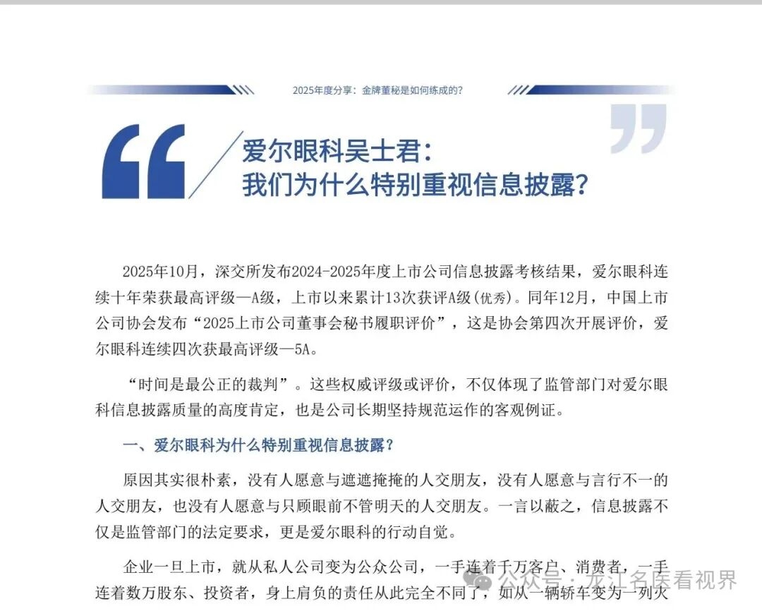 “时间是最公正的裁判”。这些权威评级或评价,不仅体现了监管部门对爱尔眼科信息披露质量的高度肯定,也是公司长期坚持规范运作的客观例证。