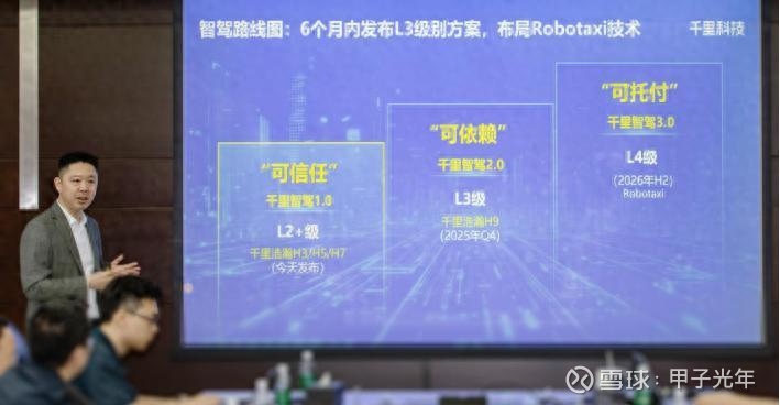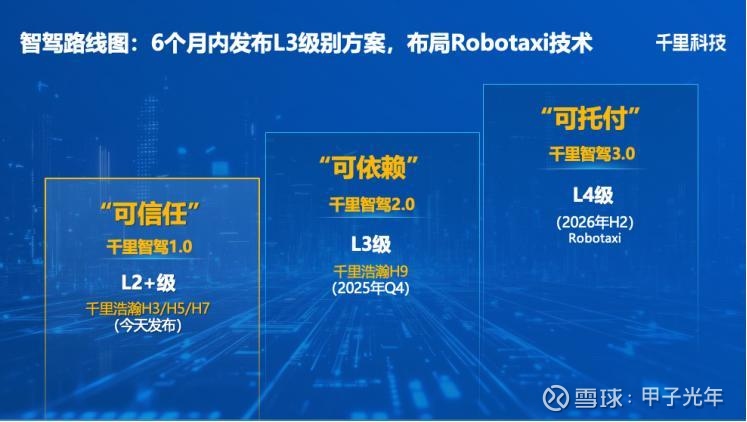 不仅如此,千里科技还公布了智能驾驶产品路线图。王军表示,千里科技将在年内发布L3级别的智驾解决方案:“千里智驾2.0”,对应千里浩瀚H9版本能力;2026年发布“千里智驾3.0”解决方案,提供L4级别的智能驾驶能力,并瞄准Robotaxi(无人驾驶出租车)行业推出。